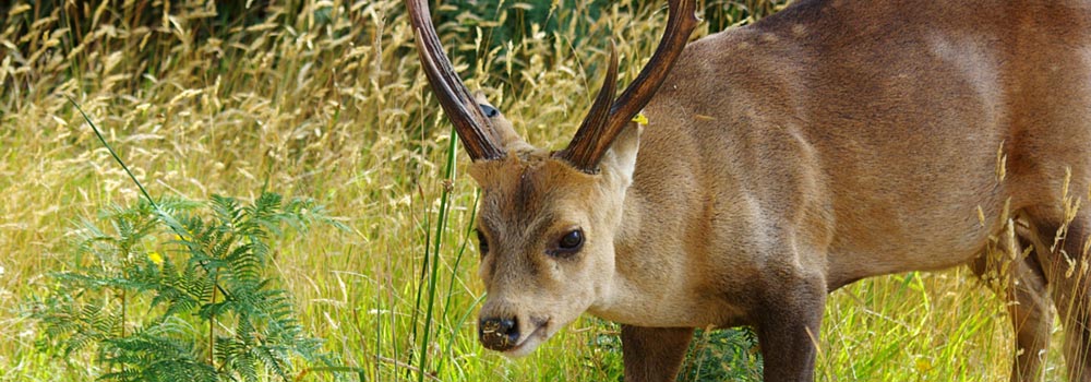 (Axis porcinus) is the rarest of Corbett's deer. It is closely related to the chital but is smaller in size. Unlike most other deer, the hog deer is not given to leaping over obstacles but instead, it escapes its predators by crouching low, ducking under obstacles. Its limbs are short and its hind legs are longer than the fore legs. This anatomy raises its rump to a higher level than the shoulders.